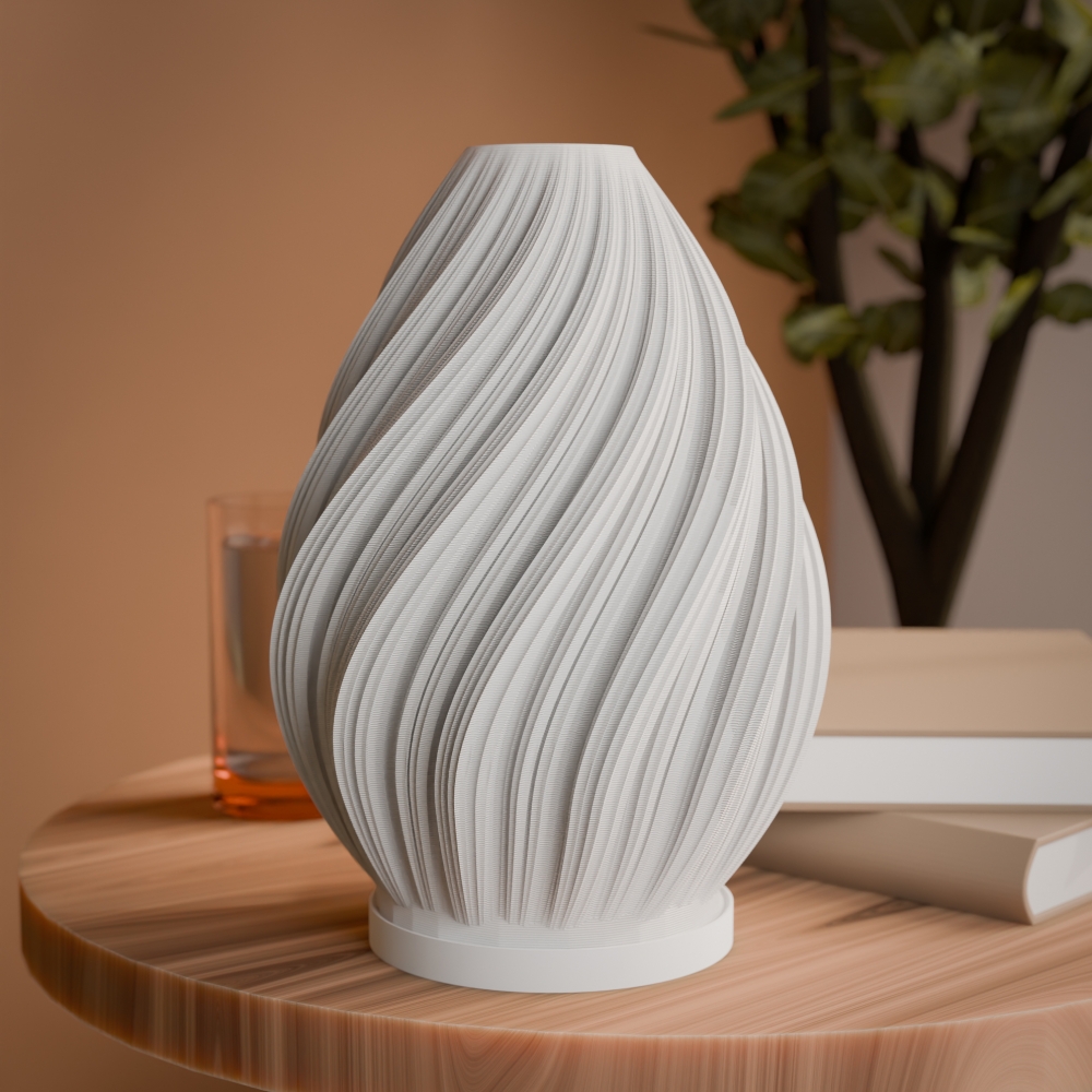 Overflaten er elegant strukturert og produsert gjennom presis 3D-printing i Norge. Den matte, hvite finishen gir lampen et rolig og sofistikert utseende både tent og avslått. Når lyset tennes, filtreres det jevnt gjennom de spiralformede linjene – og fyller rommet med et varmt, stemningsfullt lys.