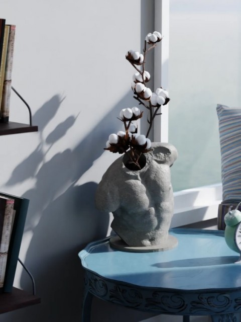 Med sin grove tekstur og skulpturelle form gir Gaddhi et inntrykk av håndmeislet stein. Den er både et dekorativt kunstverk og en funksjonell vase, perfekt til enkle stilrene blomster eller tørkede strå.